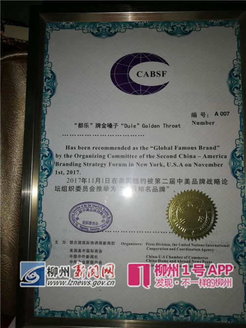 11月1日,由联合国国际协调局新闻部、美国美中国际商会、中国中外新闻社、中外企业家联合会主办,YICASHO服饰集团支持,以“弘扬品牌文化、提升品牌价值”为主题的第二届中美品牌战略论坛,在纽约长岛Leonard’s Palazzo国际宴会厅举行。在此次论坛上,金嗓子凭借在喉糖行业的专业化与国际化上取得的成就,荣获了第二届中美品牌战略论坛组织委员会推举的“世界知名品牌”殊荣。