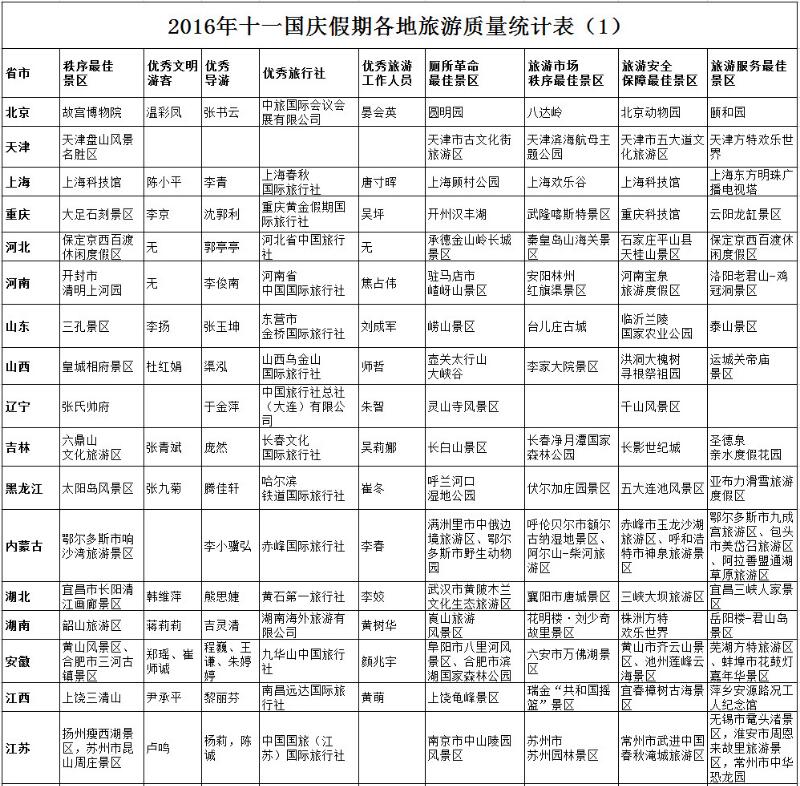 2016年十一国庆假期各地旅游质量“红榜”↓↓↓
