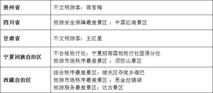 “黑榜”榜单上,发生游客与景区工作人员争执事件的北京十渡景区,安全隐患多、服务和标识系统欠缺、厕所脏乱差的张家界龙王洞景区,均上榜综合秩序最差景区。吉林省延边州4A级景区峡谷浮石林景区因安全管理制度不健全,应急预案不完善,安全责任落实不到位,景区内安全设施陈旧,警示标识缺乏,上榜旅游安全保障最差景区。国家旅游局已责成吉林省旅游部门督促相关景区进行整改。此外,因服务问题,北京途牛旅行社上榜不合格旅行社;因导游擅自增加自费项目、游客在景区乱涂乱刻等原因,5名导游和6名游客登上不合格导游和不文明游客“黑榜”。