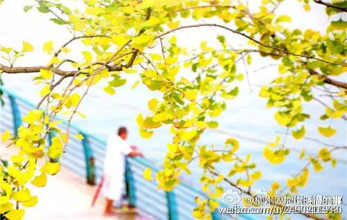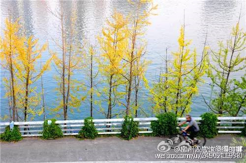 滨江东路看到柳江河堤的银杏树叶已染上秋色,金灿灿的一片,与青山碧水相衬,实在是美不胜收。