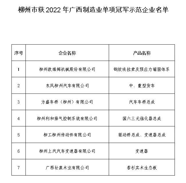 近日,自治区工业和信息化厅公布了2022年广西制造业单项示范企业名单共32企业,柳州共7家企业成功入选,占比22%,数量位居全区第二。