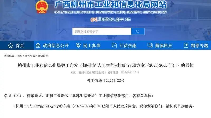 4月2日,市工业和信息化局官方网站发布《柳州市“人工智能+制造”行动方案(2025—2027年)》(以下简称《行动方案》),积极抢抓人工智能发展重大战略机遇,推动人工智能与制造业深度融合。