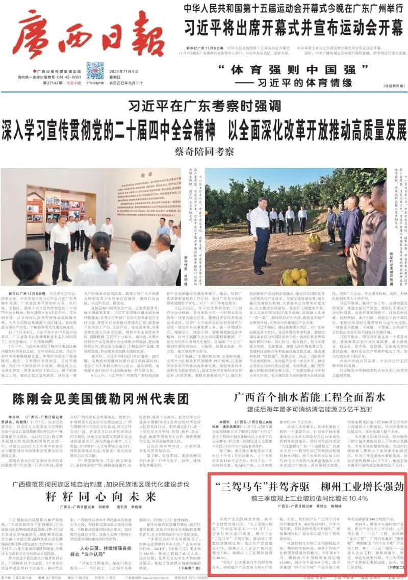 11月9日,《广西日报》头版刊发报道《“三驾马车”并驾齐驱 柳州工业增长强劲 前三季度规上工业增加值同比增长10.4%》。报道称,柳州传统产业加快转型升级、新兴产业持续发展壮大、“人工智能+制造”行动走深走实。全文如下: