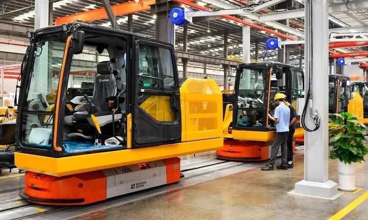 柳工挖掘机智慧工厂有轨制导车辆装配线。(资料图片)