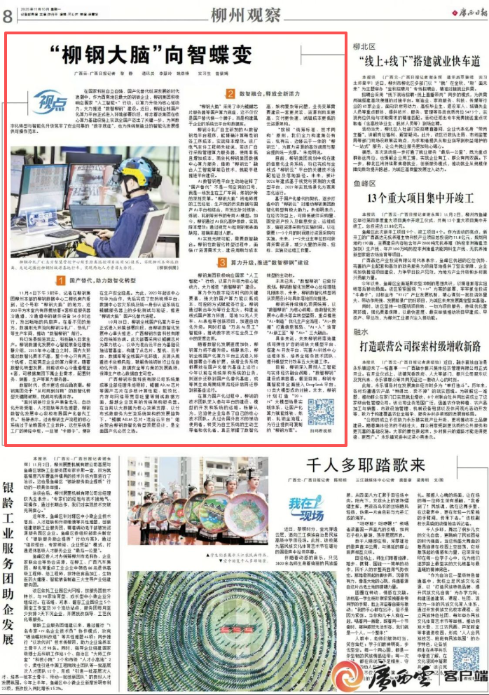 11月10日,《广西日报》8版“柳州观察”栏目,刊发文章《“柳钢大脑”向智蝶变》,全文如下:
