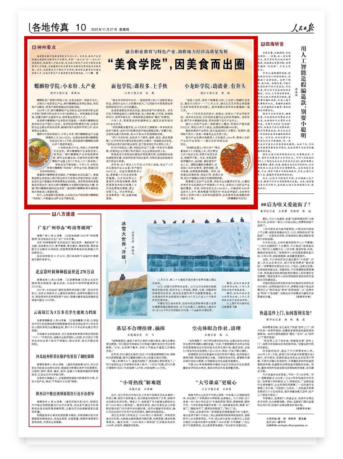 11月27日,人民日报10版头条发布柳州市融媒体中心记者采写的文章《螺蛳粉学院:小米粉、大产业》,关注了柳州产教深度融合的创新实践,与地方特色产业高质量发展同频共振。全文如下: