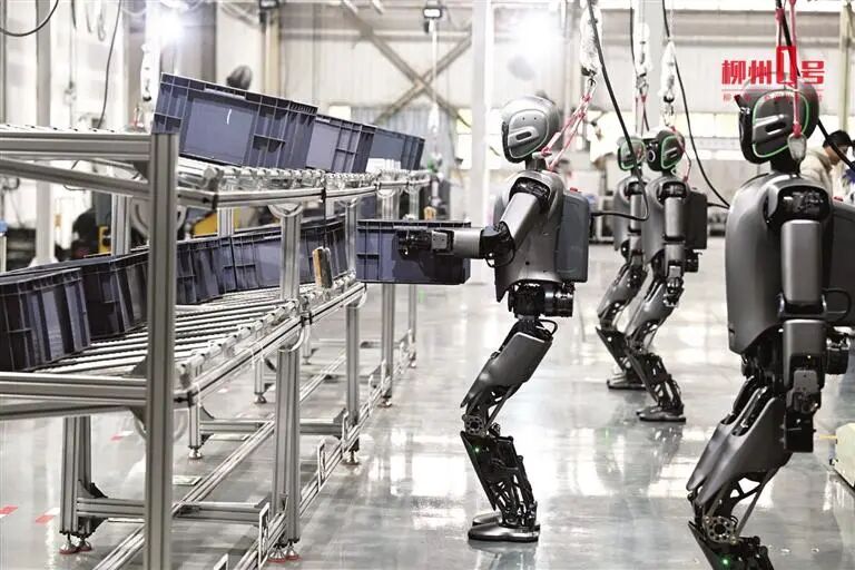 在东风柳汽商用车智能制造工厂内,10多台工业人形机器人忙着实训,有的抓取物料,有的配合无人物流车转运。“它们从最简单的分拣做起,未来有望替代重劳、危险岗位。”东风柳汽制造技术部新车工艺师陈钱说。如今,工厂AI系统优化,生产效率明显提高,还将数字化转型经验打包共享,帮上下游企业降低了转型成本。
