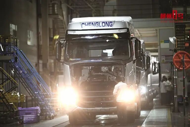 在东风柳汽商用车智能制造工厂智能化的生产线前,即将销往海外的商用车陆续下线。