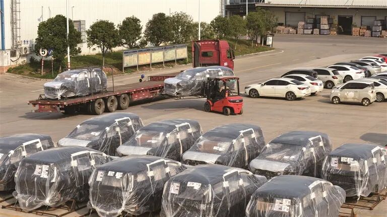 汽笛长鸣,车轮滚滚。4月9日上午,柳州雒容汽车物流基地内随处可见忙碌的身影,装卸工人驾驶集装箱正面吊运起重机来回穿梭,将装有柳产汽车车架的集装箱装入火车车厢。而在铁路的另一侧,身着橘色制服的驾驶员娴熟地驾驶着柳产汽车,稳稳驶入JSQ6型双层运输汽车专用车厢。