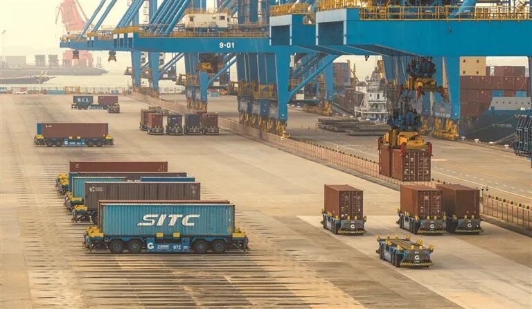 11日清晨,北部湾港钦州自动化码头上忙碌的自动化装运场景。