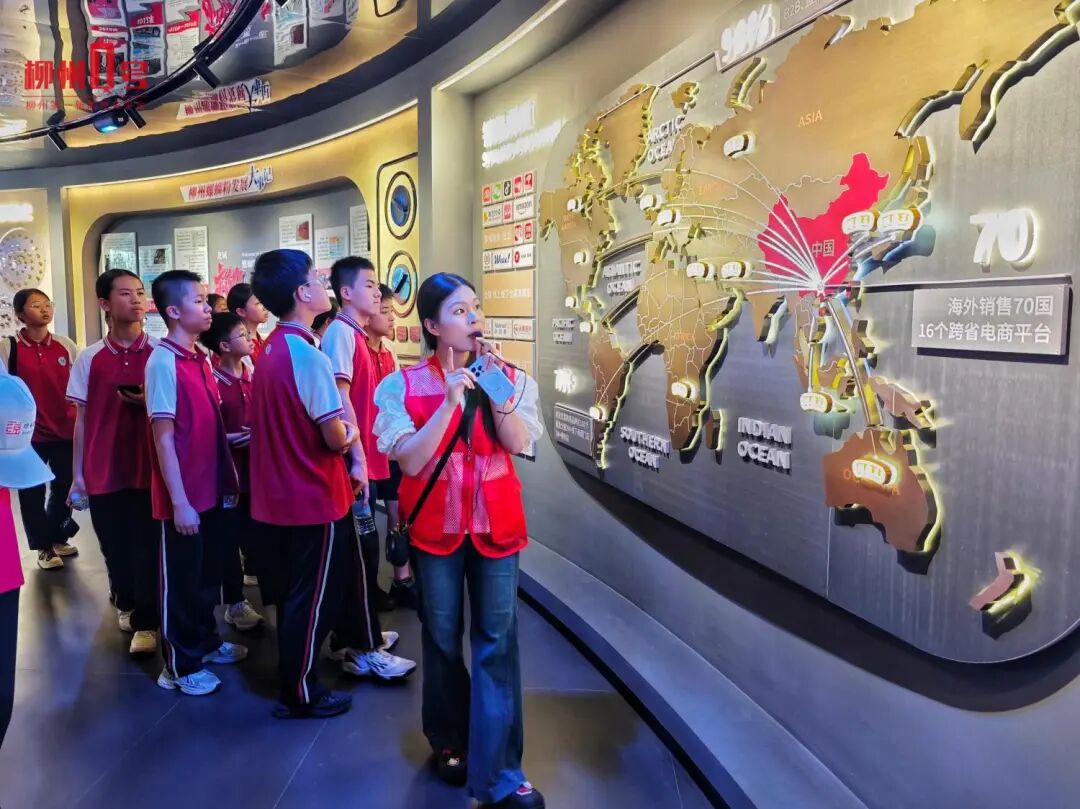 4月14日,广西螺霸王食品科技有限公司螺蛳粉文化展览馆内,讲解员向前来参观游学的学生介绍预包装柳州螺蛳粉出口情况。