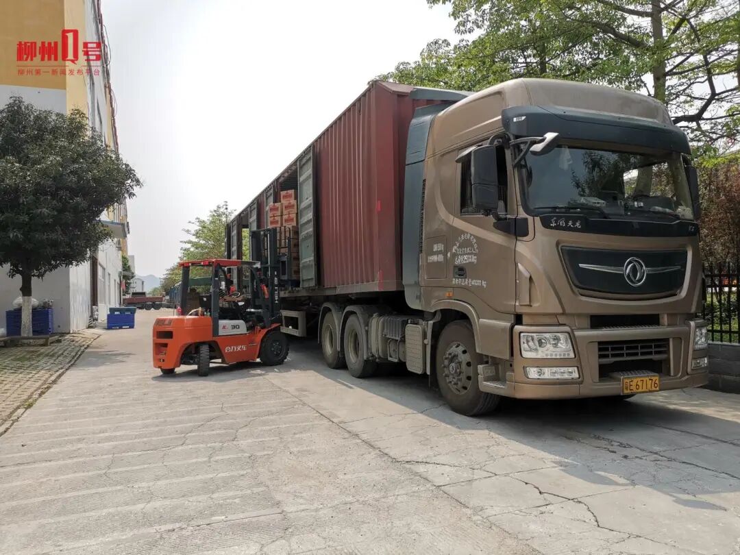 发往海外的预包装柳州螺蛳粉正在装车等待运输。(此图由受访者提供)