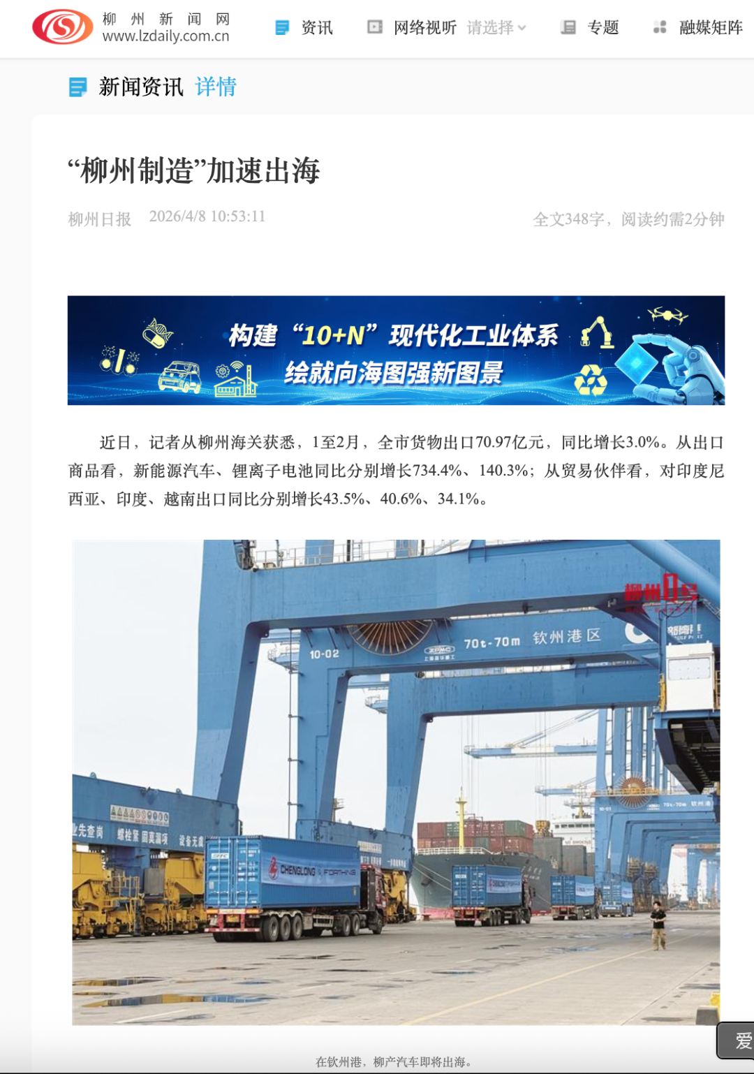 今年以来,我市加快汽车出口步伐,多款车型在海外上市;柳工也掀起全球交付热潮,装载机国际单日发运量连续突破百台;柳州国轩在全区率先开展汽车锂电池危险包装智慧商检改革;东风柳汽还与北部湾港集团正式签署战略合作协议,以“汽车智造+港口物流”协同服务广西向海经济与西部陆海新通道建设,为广西汽车、工程机械出口打通了稳定、高效、便捷的物流新通道。
