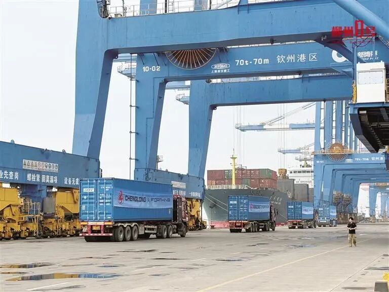 货车把铁海联运货物运抵北部湾港钦州自动化码头。
