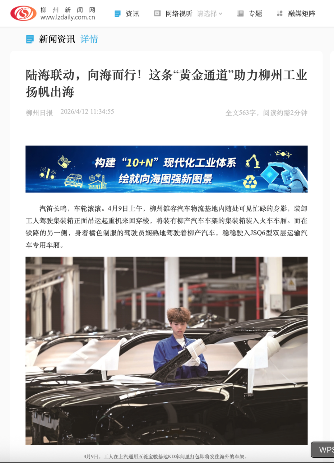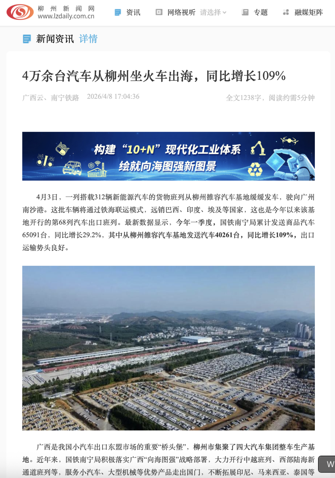 最新数据显示,今年一季度,国铁南宁局累计发送商品汽车65091台,其中柳州雒容汽车基地发送40261台,同比增长109%。从整车到 KD件,从新能源汽车到锂电池,铁海联运以高效、安全、低成本的优势,成为柳州工业出海的“黄金通道”。