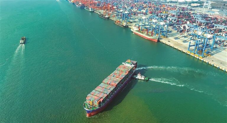 满载货物的货轮从北部湾港钦州自动化码头启航。