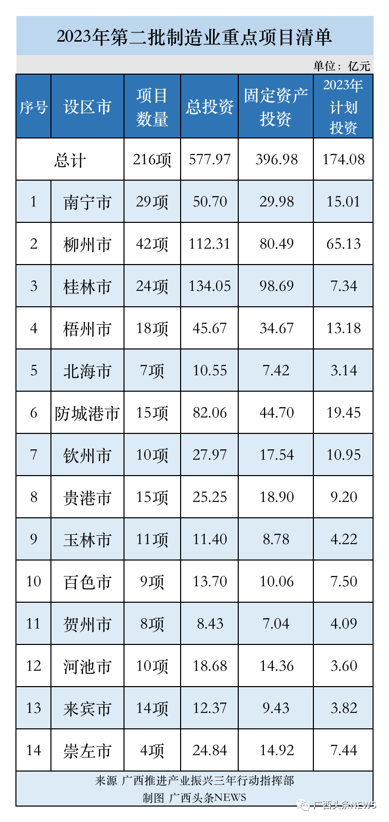 7月4日,广西公布2023年第二批制造业重点项目清单,此次安排重点项目共216项,总投资578亿元,看看各市都有哪些?