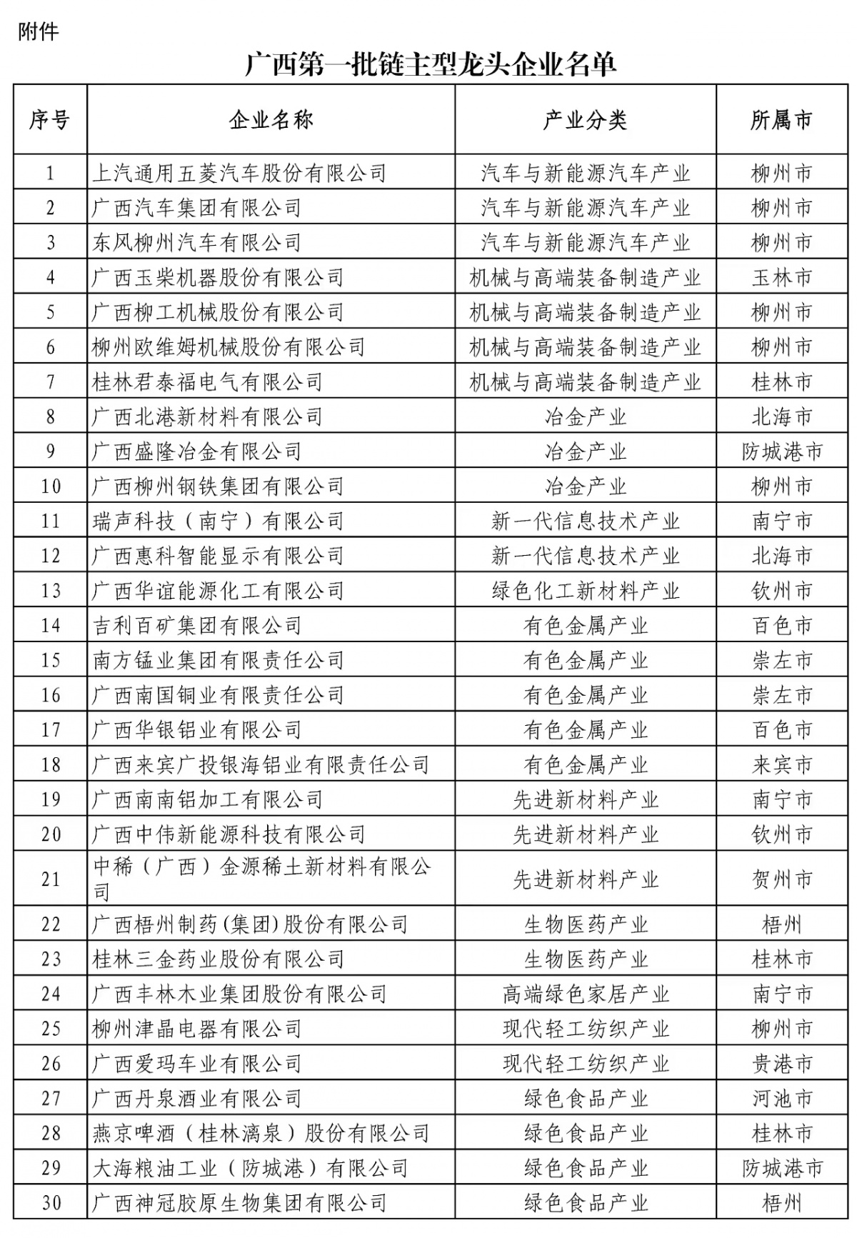 7月14日,自治区工业和信息化厅印发《自治区工业和信息化厅关于公布广西第一批链主型龙头企业的通知》(桂工信综合〔2023〕448号),公布了30家广西第一批链主型龙头企业名单。其中,柳州市上榜企业7家,数量居全区第一。