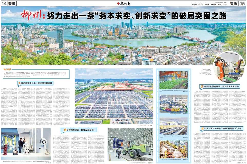 3月5日,《广西日报》刊发报道《柳州:努力走出一条“务本求实、创新求变”的破局突围之路》,报道称,2023年以来,柳州市持续扩大对内对外开放,紧抓自治区打造国内国际双循环市场经营便利地契机,全力推进新型工业化、建设现代制造城,努力走出一条“务本求实、创新求变”的破局突围之路,推动中国式现代化柳州实践实现新进展、取得新成效。