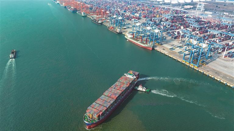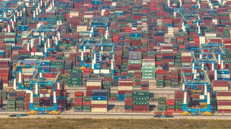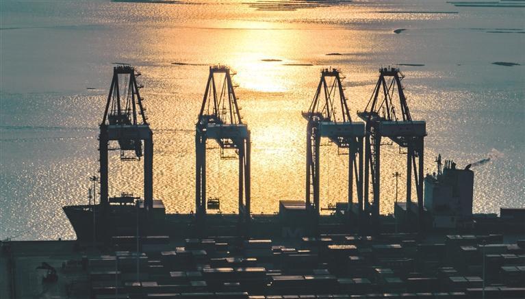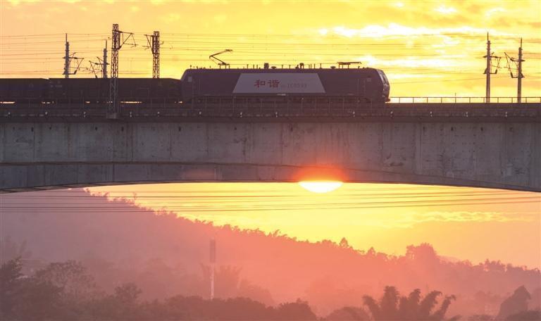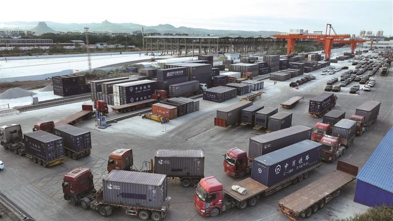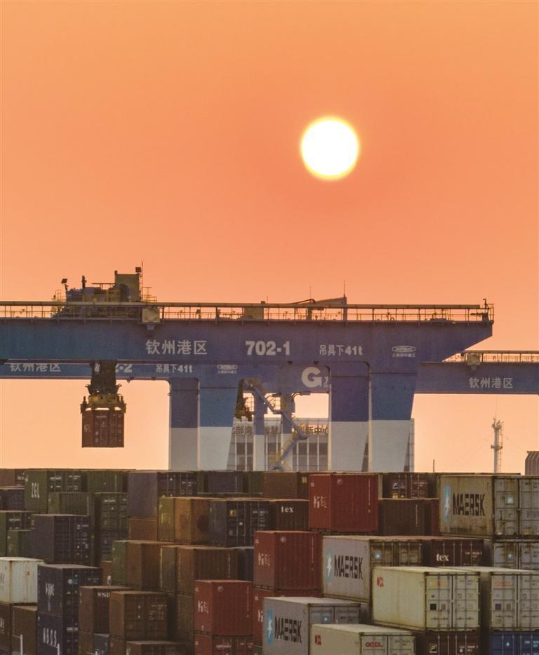 车间连着车厢,下车即上船。在钦州铁路集装箱中心站场,站内龙门吊高高耸立,精准地吊运着一个个集装箱,铁轨上列车穿梭,满载着各类货物。在钦州港自动化集装箱码头上,智能设备自主运行,装卸、运输一气呵成。新能源汽车等柳州制造产品从柳州汽车城搭乘火车直达这里,登上海轮后奔向海外。