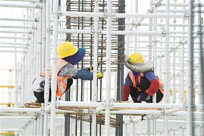 工人在盘扣式脚手架上施工