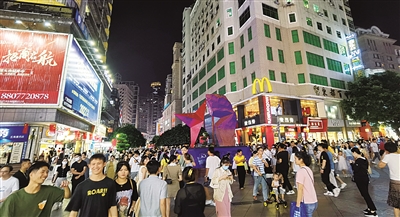 夜幕降临,城中区风情港便民夜市疏导点人流如织。在一家柳州螺蛳粉摊前,食客们排着长队。在五星商场里,醒目的优惠折扣吸引众多消费者。