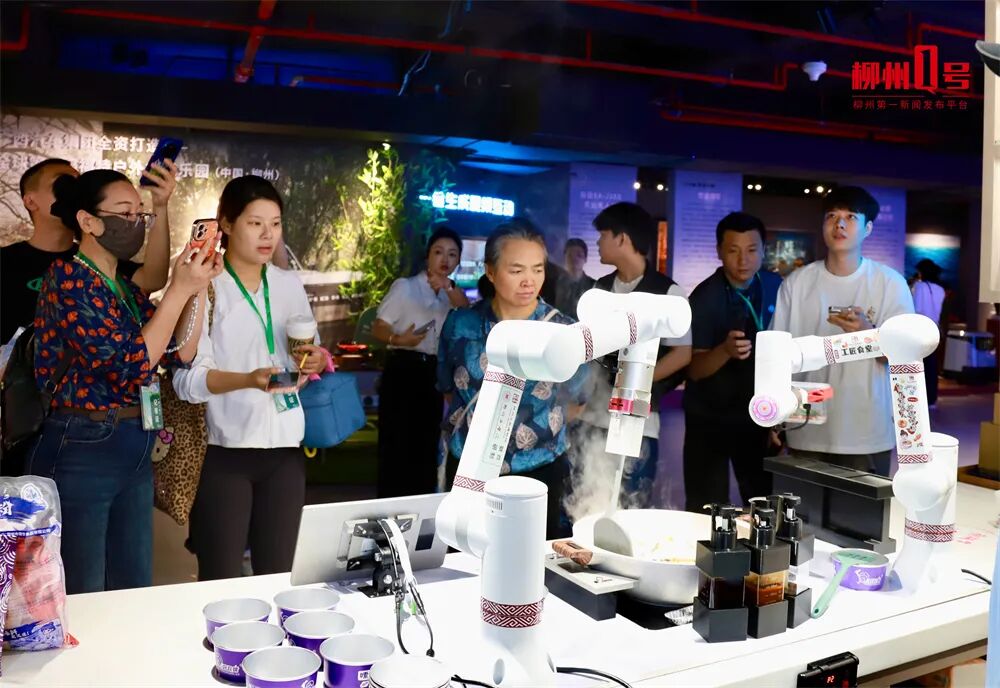 走进展馆内,钢铁悟语装置艺术展以工业遗存重构艺术,由老旧机器零件创意再造的装置作品静静陈列,游客佩戴AI眼镜即可与展品实时互动,在虚实交融间感受工业美学的焕新;人工智能演艺区内,看机器人“奶爸”教优必选机器人学“做人”、人机共舞节目将机械动作与民族舞蹈巧妙结合,趣味十足;在线观看在柳州举办的中国—东盟电子体育交流赛,全国各地多支参赛队伍展开激烈角逐,点燃现场激情;工匠食堂里,机械臂现炒柳州螺蛳粉香气四溢,烟火气与科技感相融共生;人工智能文创区内,工业IP与实时人像一键融合,即时生成创意视频,让城市记忆与数字创新精彩碰撞。
