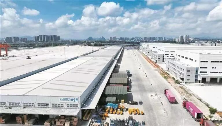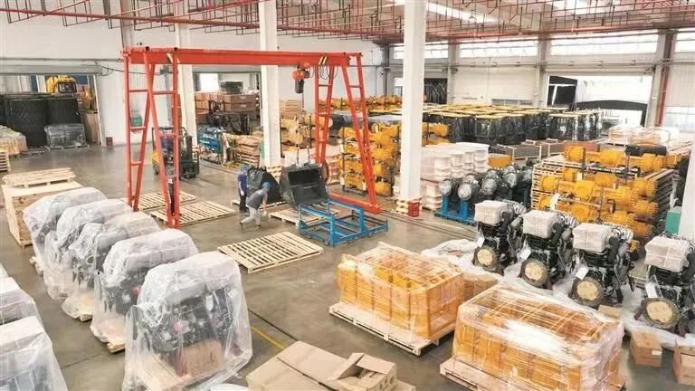 8月5日上午, 位于柳工大道东侧的西部陆海新通道柳州铁路港核心区的10栋仓库里一派繁忙景象,工程机械产品拆分、集装箱装运……10辆满载工程机械产品的货车陆续驶出柳州铁路港,产品将通过公海联运出口印度。