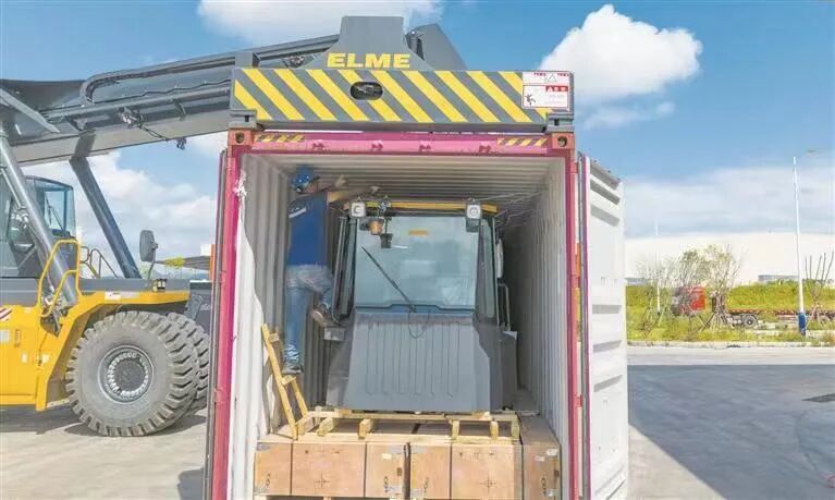 8月5日,工人驾驶大型设备把满载工程机械的集装箱吊上货车。