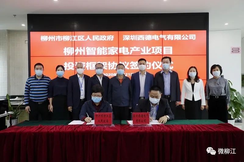 21日,柳江区人民政府与深圳西德电气有限公司签订智能家电产业项目投资框架协议书。由深圳西德电气有限公司在新兴工业园区投资建设新能源项目,主要进行智能门锁和低、高压成套开关设备研发与生产,以加快柳江区工业高质量发展进程,助推柳州轻工产业发展。