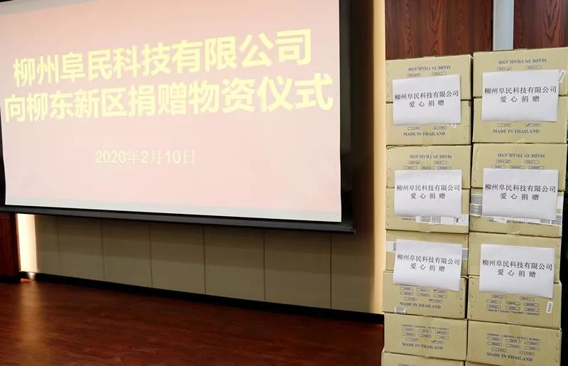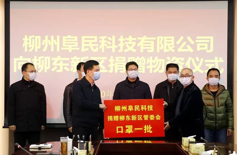 2月10日,企业复工首日,通过一个简单的捐赠仪式,在市委副书记、柳东新区党工委书记梁旭辉等市、新区领导的见证下,柳州阜民科技有限公司副总经理莫良忠把境外采购的4万个口罩,正式交到柳东新区管委会主任何培俊的手上。