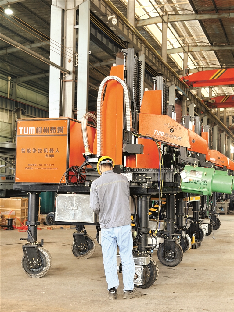 位于柳江区新兴工业园的柳州泰姆预应力机械有限公司(以下简称“柳州泰姆”),生产车间内机器轰鸣,工人正在忙着装配智能张拉机器人,为桥梁建设提供“硬核装备”。