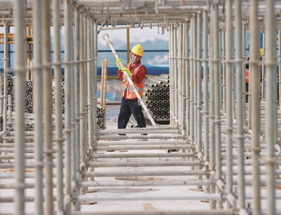 工人在架设模板支撑架。