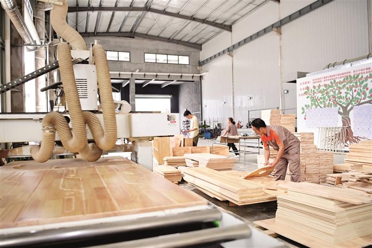 工人在幼教木桌椅生产车间里忙碌着。